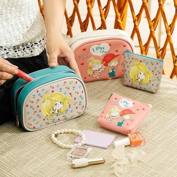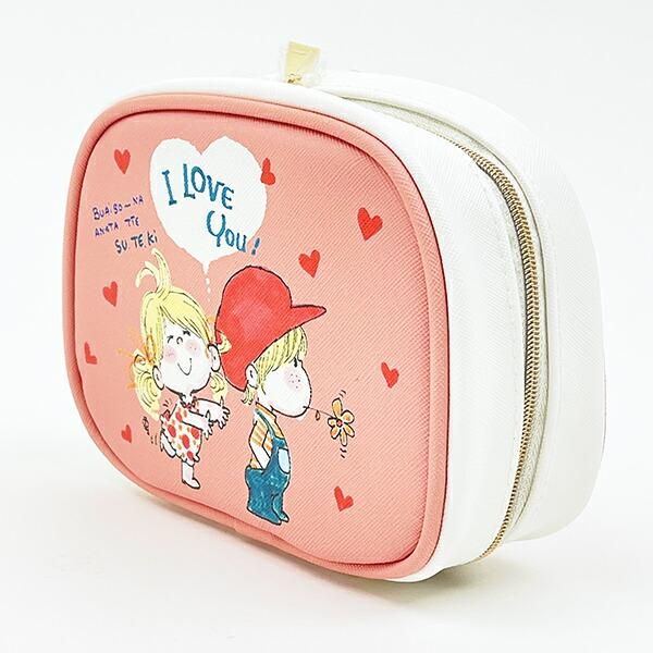 メイク用品や小物を入れるのにぴったりな水森亜土のラウンドポーチです。ラウンド型なのでガバっと開いて取り出しやすい☆亜土ちゃんらしい可愛いカップルデザイン♪ハートがたくさん飛んでいてとってもキュートです☆彡
