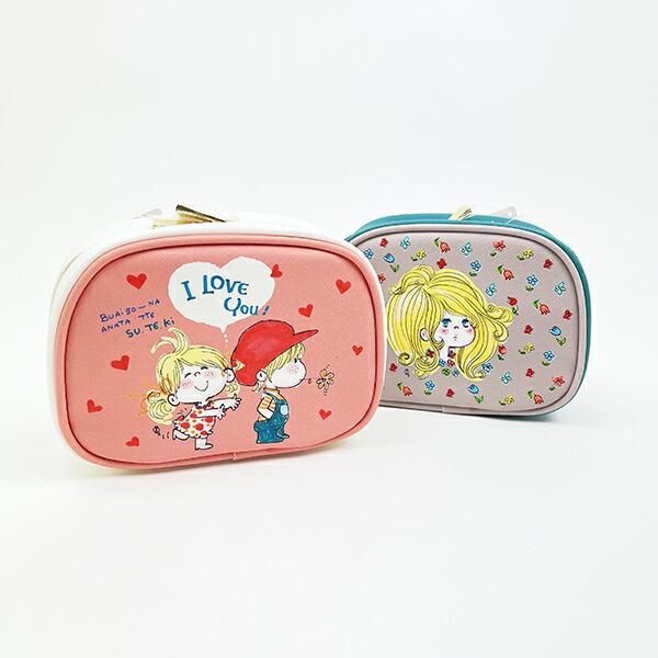メイク用品や小物を入れるのにぴったりな水森亜土のラウンドポーチです。ラウンド型なのでガバっと開いて取り出しやすい☆亜土ちゃんらしい可愛い女の子デザイン♪お花がたくさん飛んでいてとってもキュートです☆彡
