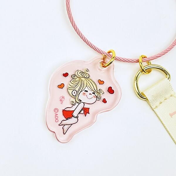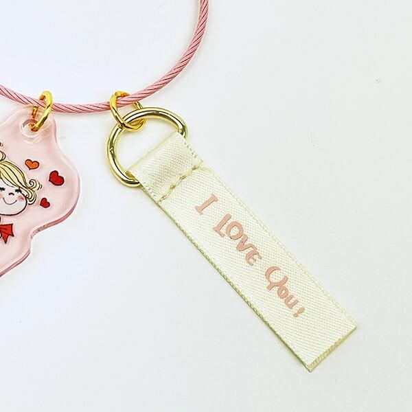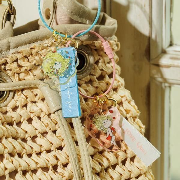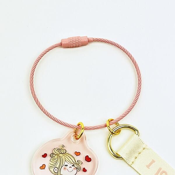 水森亜土のチャーム付きワイヤーキーリングです。鍵をつけるのはもちろん、カラーワイヤーリングなのでバッグなどのキーホルダーとしても可愛い♪ワイヤーの金具は回すと外せます!亜土ちゃんらしい可愛らしいデザインなので亜土ちゃん好きの方へのプレゼントにもおすすめです☆彡【サイズ】アクリルパーツ:4cm×3.6cm×0.3cm、リボンパーツ:5cm×1.2cm