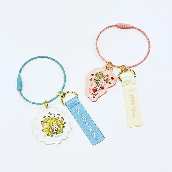 水森亜土のチャーム付きワイヤーキーリングです。鍵をつけるのはもちろん、カラーワイヤーリングなのでバッグなどのキーホルダーとしても可愛い♪ワイヤーの金具は回すと外せます!亜土ちゃんらしい可愛らしいデザインなので亜土ちゃん好きの方へのプレゼントにもおすすめです☆彡【サイズ】アクリルパーツ:4cm×3.6cm×0.3cm、リボンパーツ:5cm×1.2cm