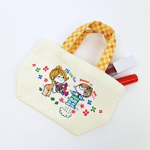 水森亜土のミニトートバッグです。小物を入れるのにぴったり◎年代問わずお使いいただける可愛いデザインなので亜土ちゃん好きにはたまらない〜♪ぬいぐるみに持たせても可愛いのでぬい活にもgood◎プレゼントなどにも喜ばれそうです☆彡