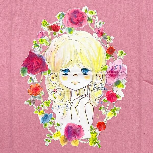 水森亜土 お花の少女柄 プリント半袖Tシャツ(LL) ローズピンク アパレル